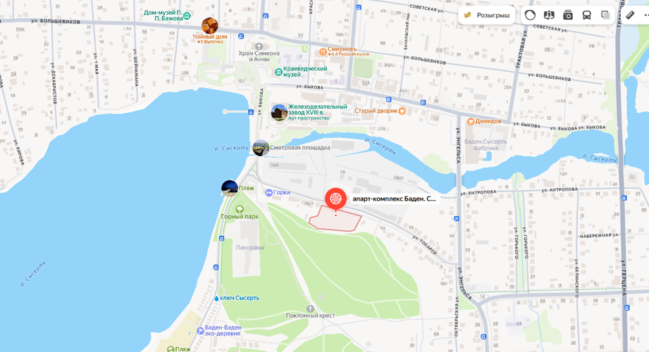 Сысерть,где расположены апартаменты Баден Баден Вдохновение, является родиной русского писателя П.Бажова, здесь много исторических достопримечательностей для гостей